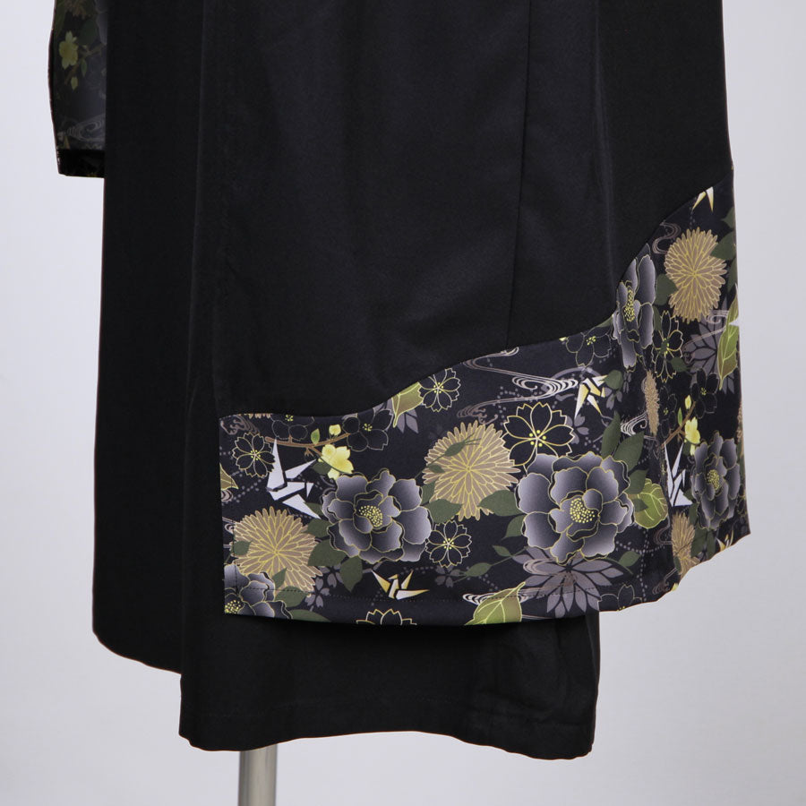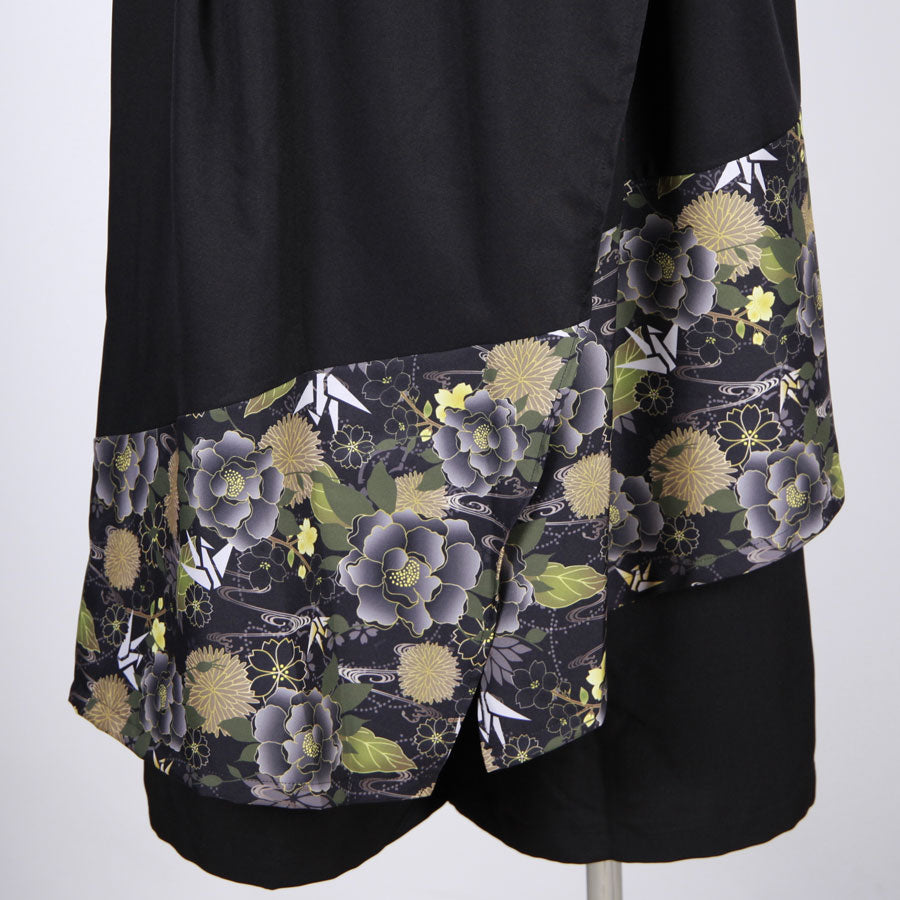 あて布の裾には、ぐるりと菊や芍薬、八重桜などの吉祥花の中に跳ぶ折り鶴の新しい黒色ベースの新しい和柄を切り替えてあります。