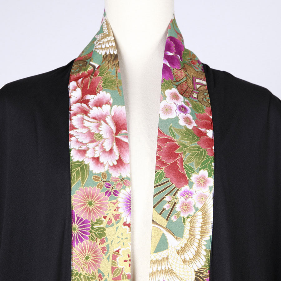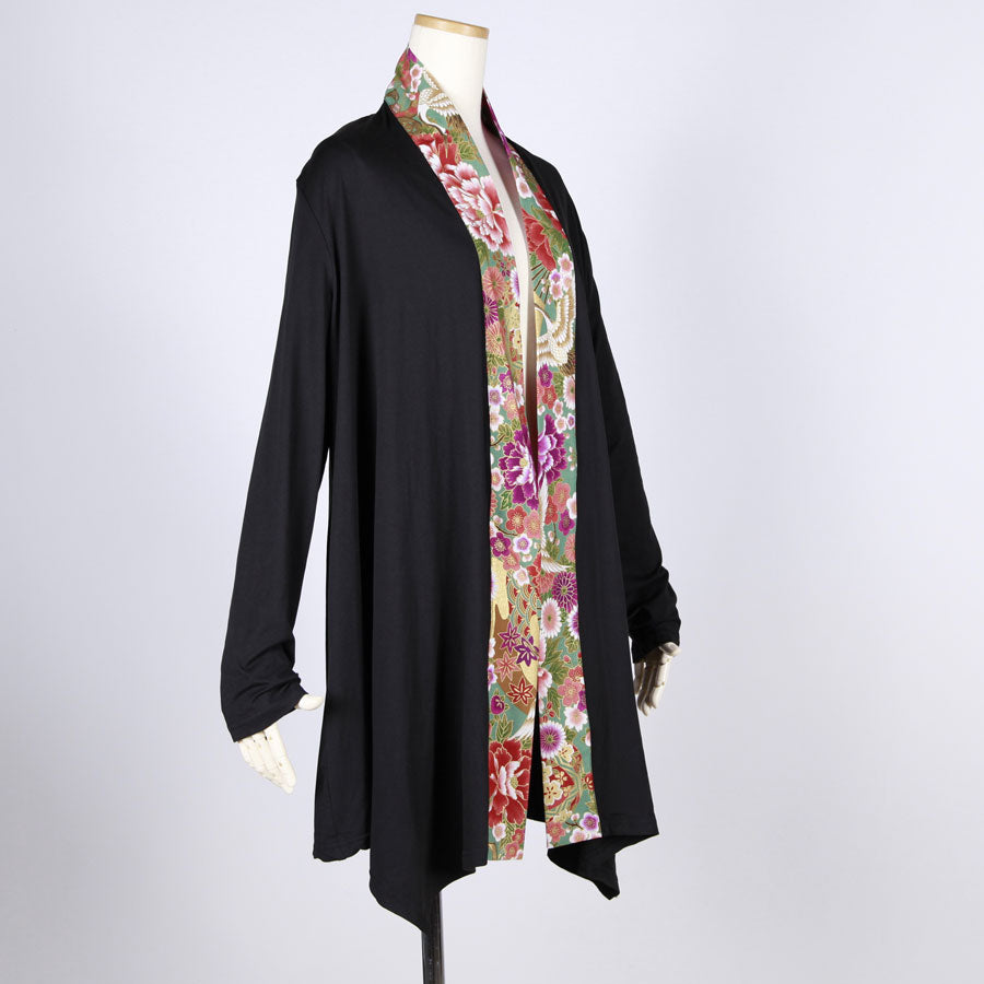 前みはぐるっと首元に数種類の吉祥花の中に迷い込んだような鶴が描かれた友禅の様な和柄を袈裟の様にかけたデザインの羽織り。