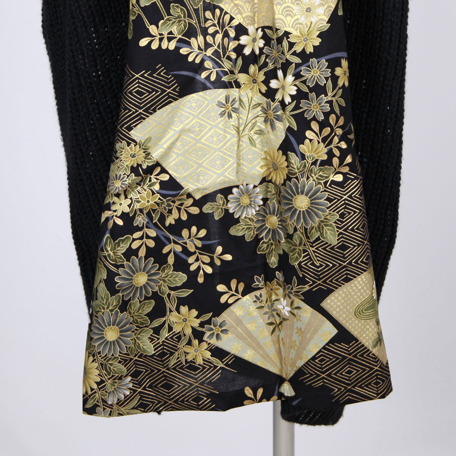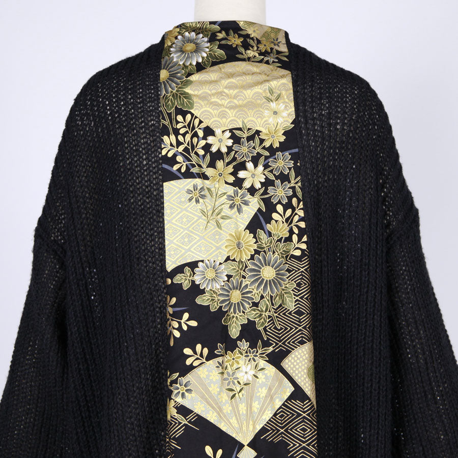 後ろに太めに漆黒の中に菱形と菊、桜、と吉祥紋様が入った扇子が舞飛ぶ、まるで留袖の様な模様の和柄を切り替えたニットのロングカーディガン。
