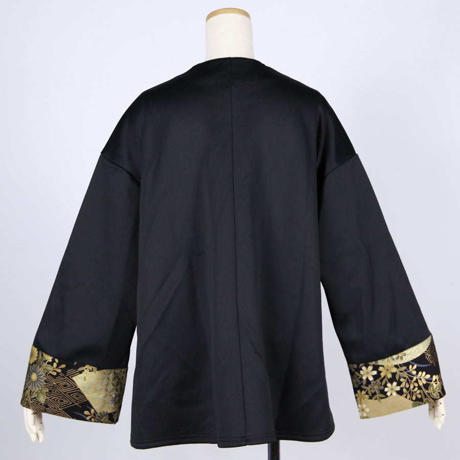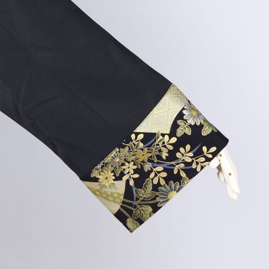 袖口には太めに漆黒の中に菱形と菊、桜、と吉祥紋様が入った扇子が舞飛ぶ、まるで留袖の様な模様の和柄をカフスとして使用しました。