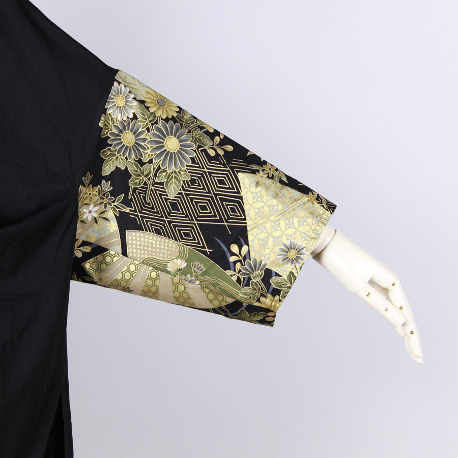 袖に漆黒の中に菱形と菊、桜、と吉祥紋様が入った扇子が舞飛ぶ、まるで留袖の様な模様の和柄を使ったトップス。