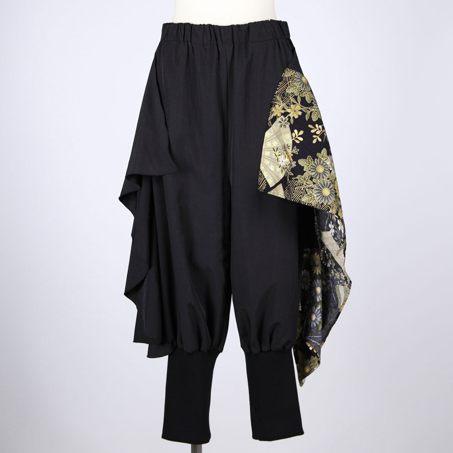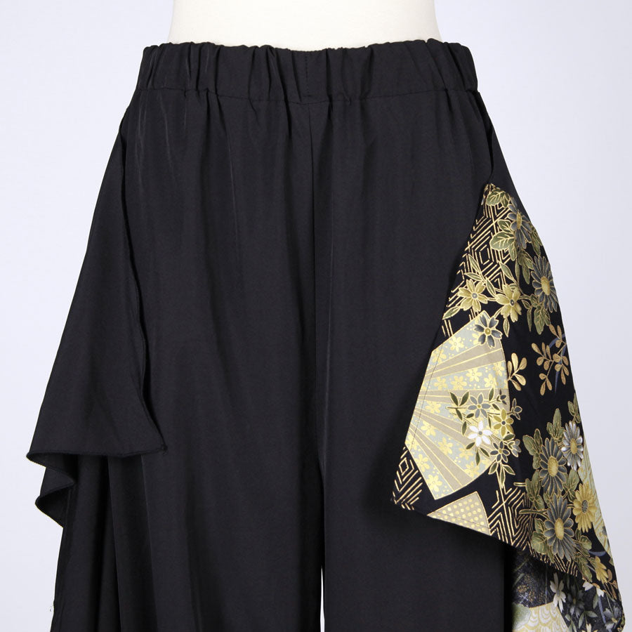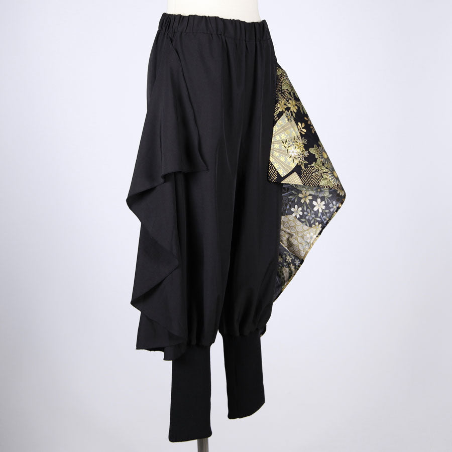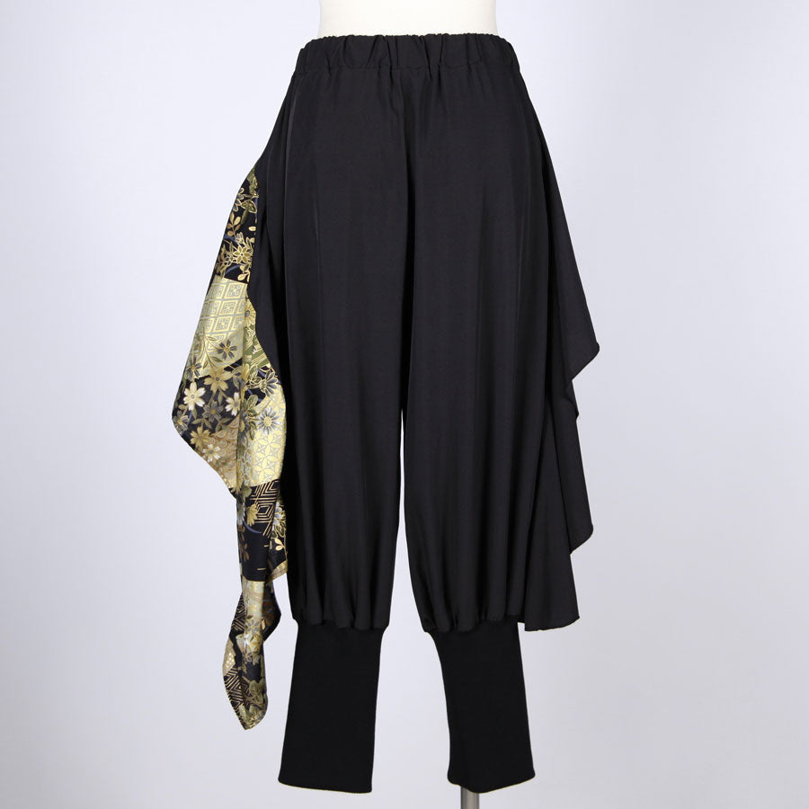 両脇にひらひらとした生地をつけたデザインのパンツ。