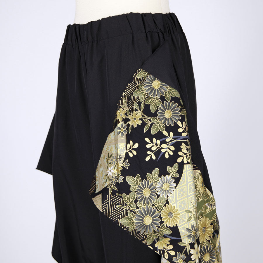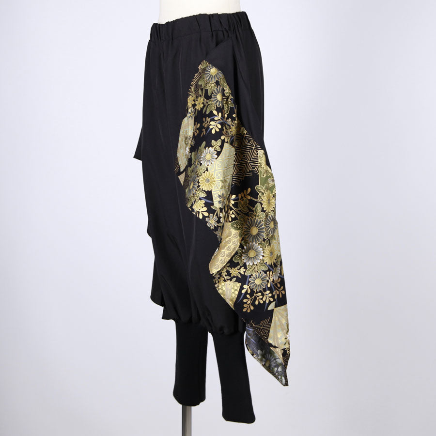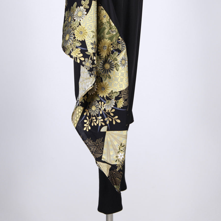 左側は漆黒の中に菱形と菊、桜、と吉祥紋様が入った扇子が舞飛ぶ、まるで留袖の様な模様の和柄を使っています。
