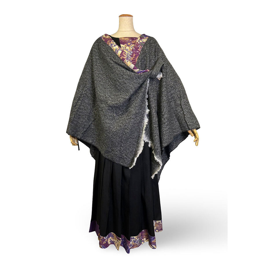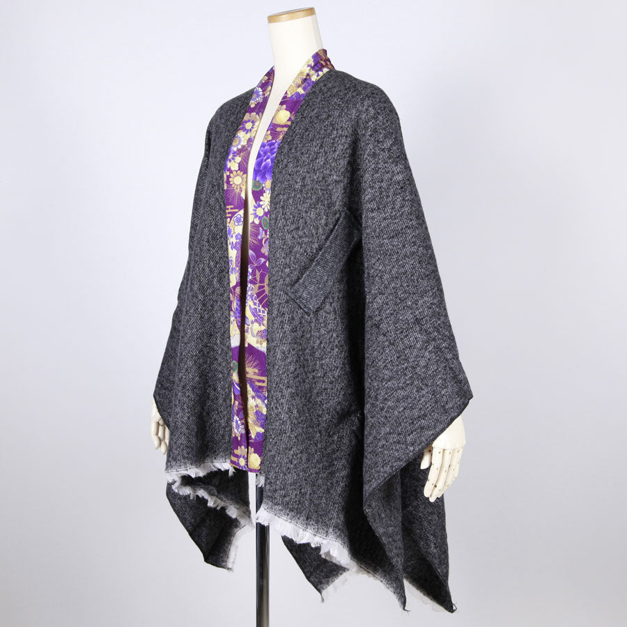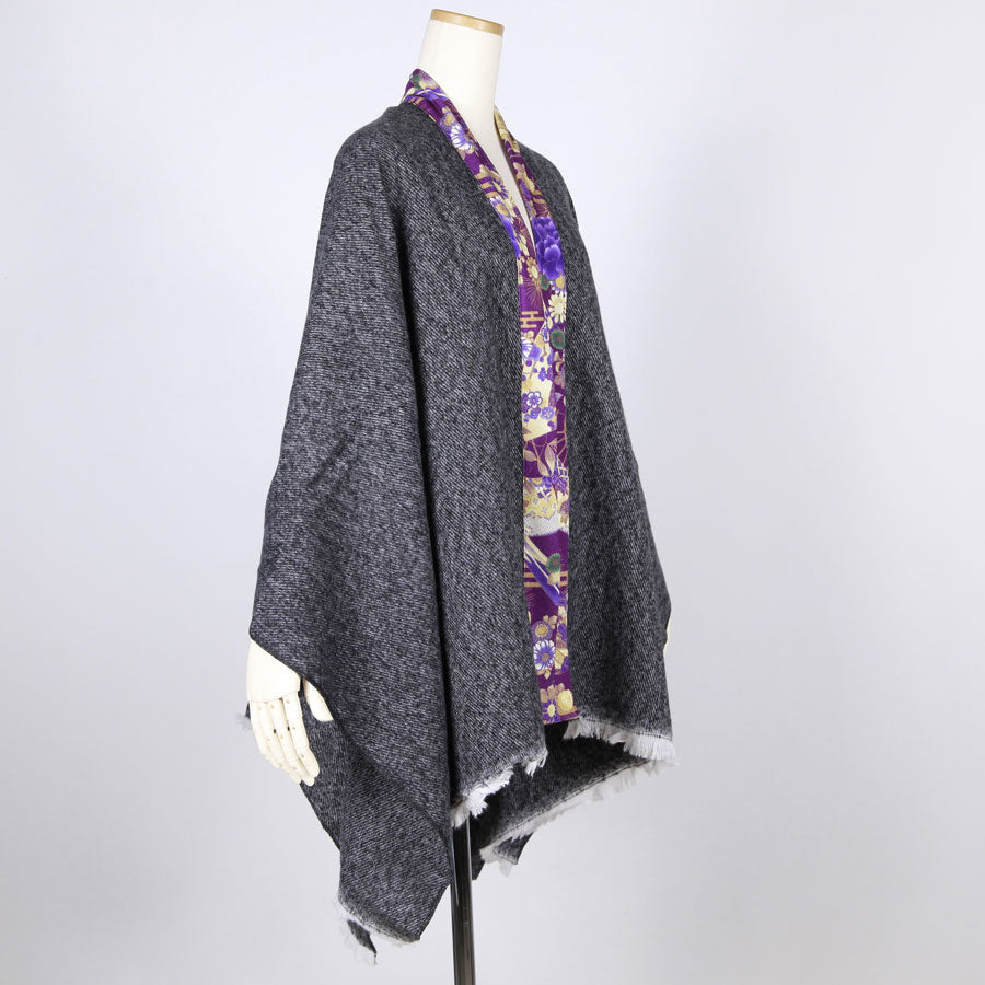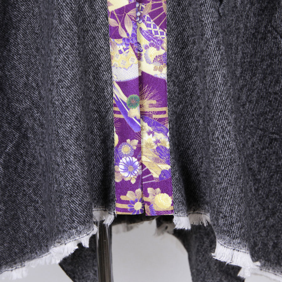 真四角のストールにスリットを開けて、そこに牡丹、菊、松の葉、扇子などのおめでたい吉祥紋様が描かれた紫地の縮緬素材の和柄を前立ての様に作ったポンチョです。