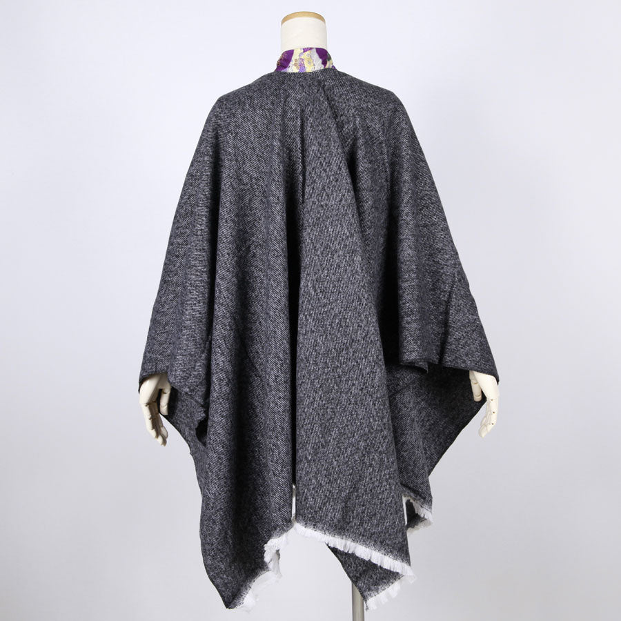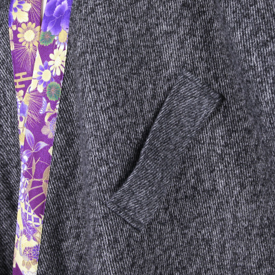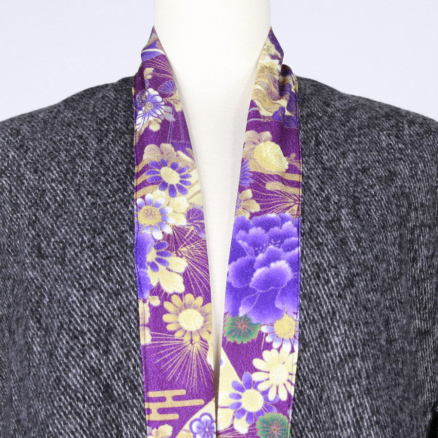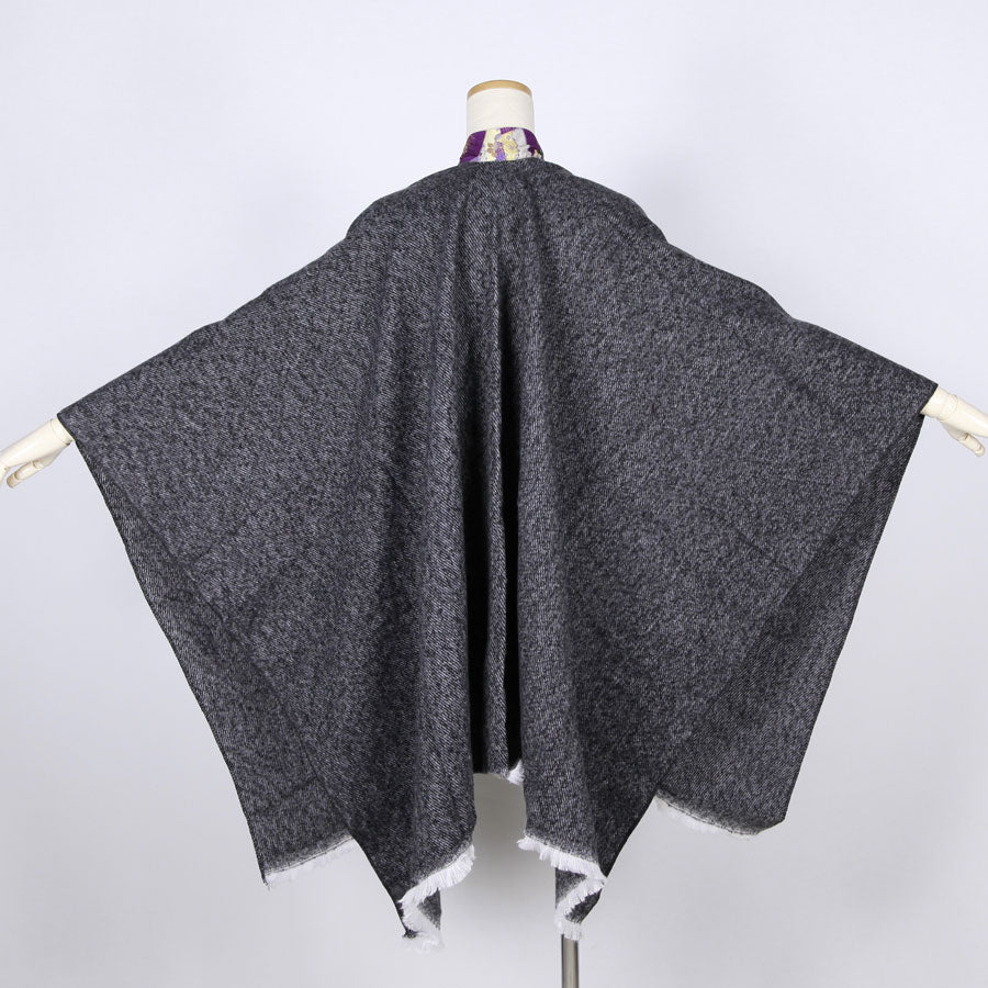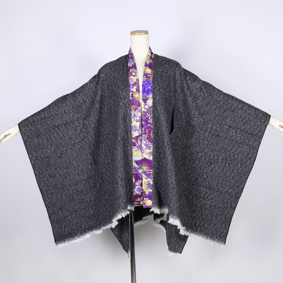 真四角のストールにスリットを開けて、そこに牡丹、菊、松の葉、扇子などのおめでたい吉祥紋様が描かれた紫地の縮緬素材の和柄を前立ての様に作ったポンチョです。