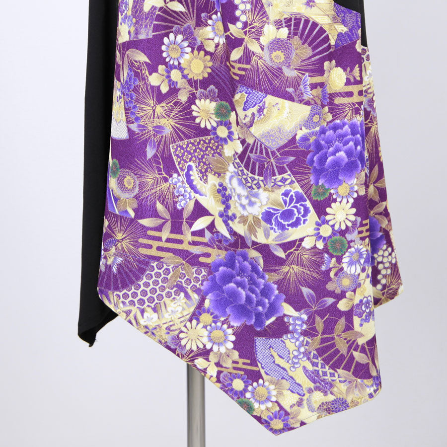左見頃から後ろに向けて牡丹、菊、松の葉、扇子などのおめでたい吉祥紋様が描かれた紫地の縮緬素材の和柄を切り替えています。