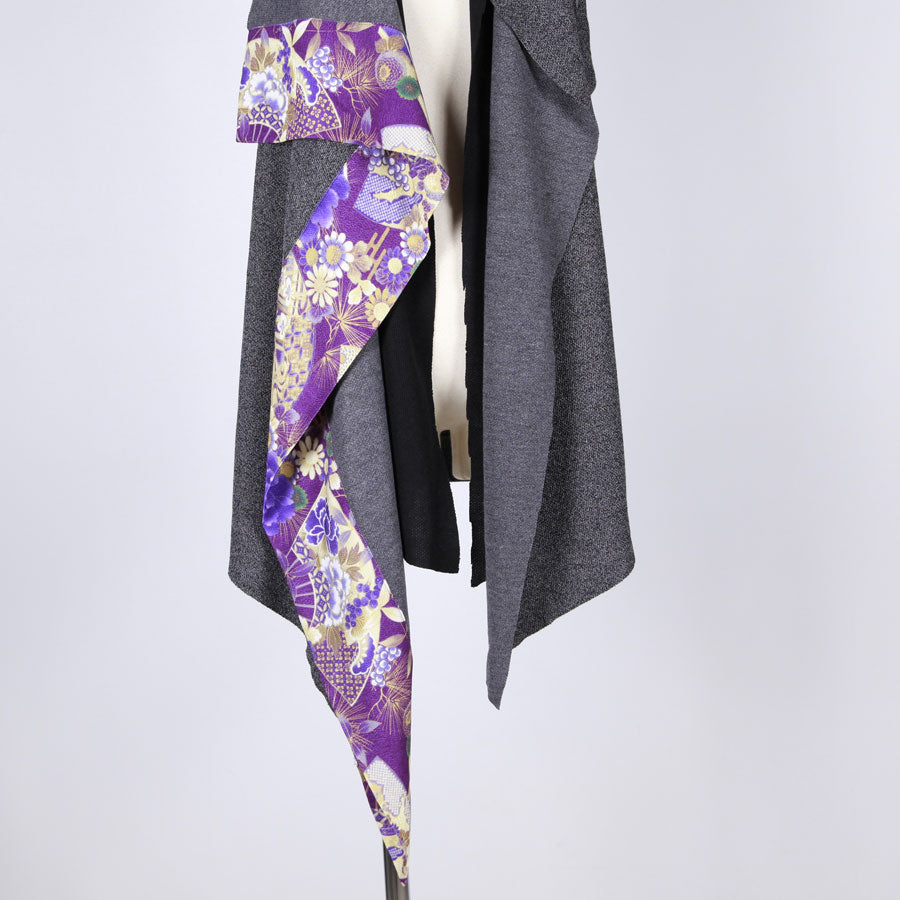 右前見頃端には、牡丹、菊、松の葉、扇子などのおめでたい吉祥紋様が描かれた紫地の縮緬素材の和柄を切り替えてあります。