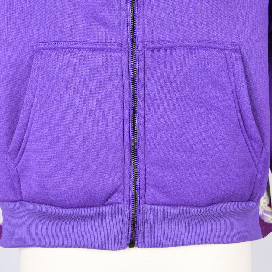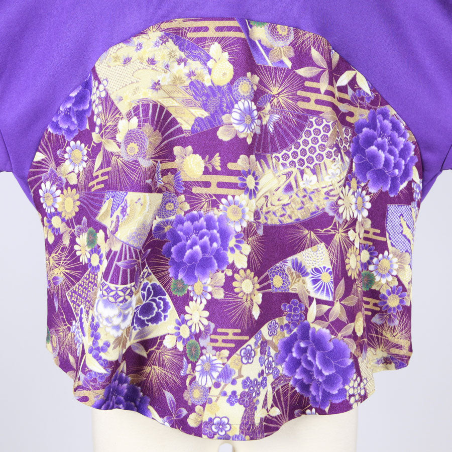 前から見ると両脇にちらりと見える牡丹、菊、松の葉、扇子などのおめでたい吉祥紋様が描かれた紫地の縮緬素材の和柄。