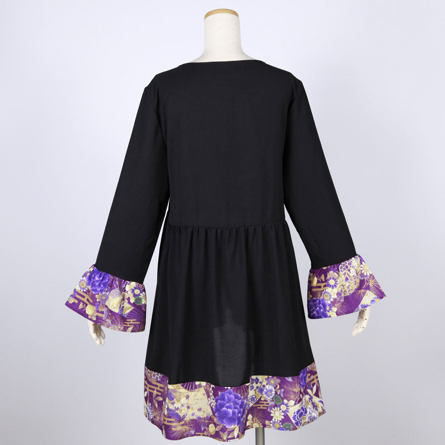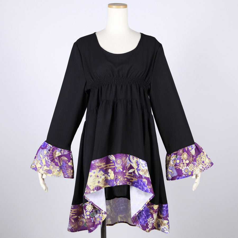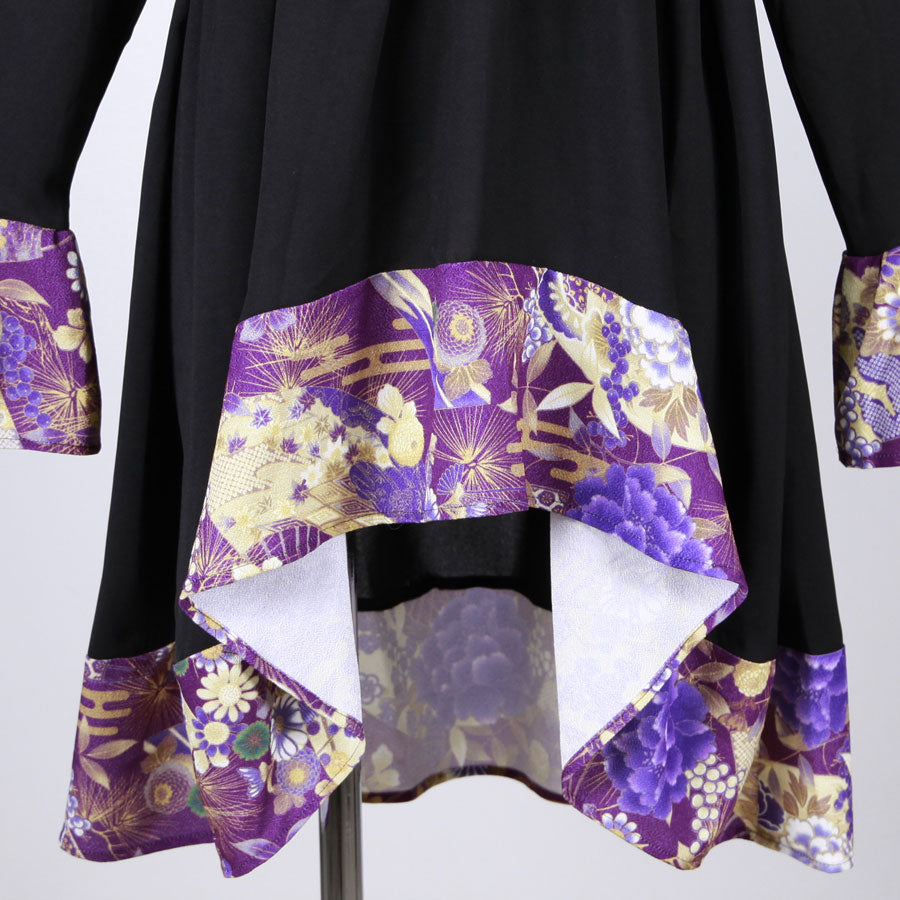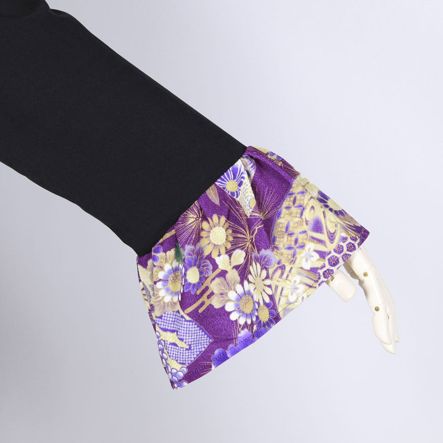 ギャザーを入れた袖口とぐるっと切り替えた裾部分には牡丹、菊、松の葉、扇子などのおめでたい吉祥紋様が描かれた紫地の縮緬素材の和柄を使っています。