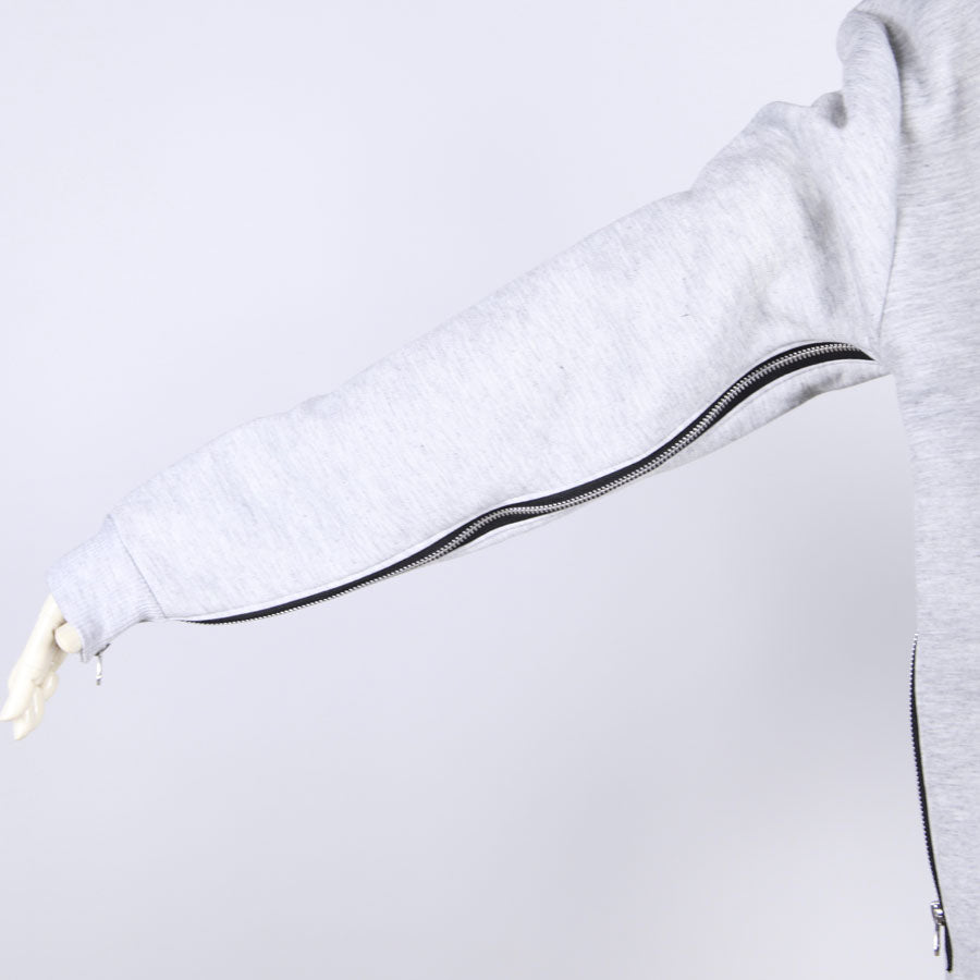 右袖から右脇にかけてジッパーが付いていて、開けたり閉めたりするバランスで色々なシルエットになるトレーナー。