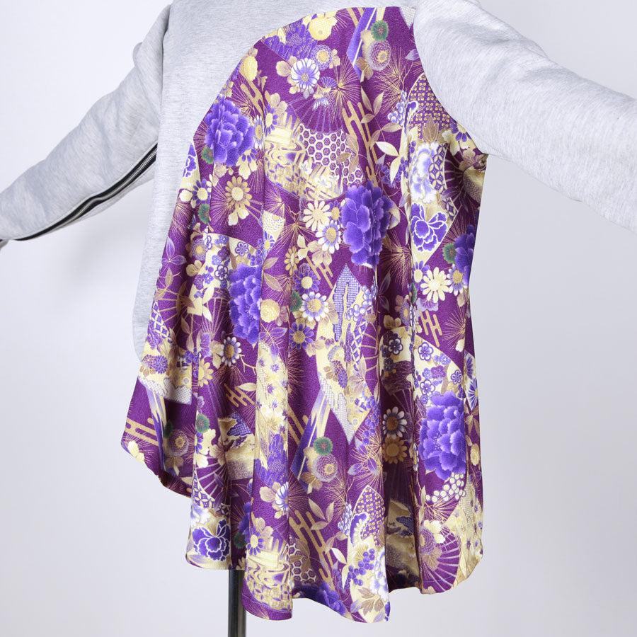 前見頃の左脇から後ろにかけて牡丹、菊、松の葉、扇子などのおめでたい吉祥紋様が描かれた紫地の縮緬素材の和柄を切り替えてあり、フレアーが入るようなデザインです。