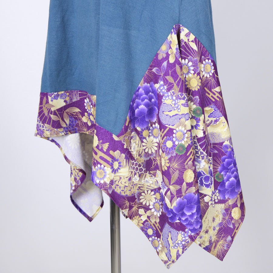 両脇と裾には牡丹、菊、松の葉、扇子などのおめでたい吉祥紋様が描かれた紫地の縮緬素材の和柄を切り替えてあり、裾に向かって広がるようなシルエットにしています。