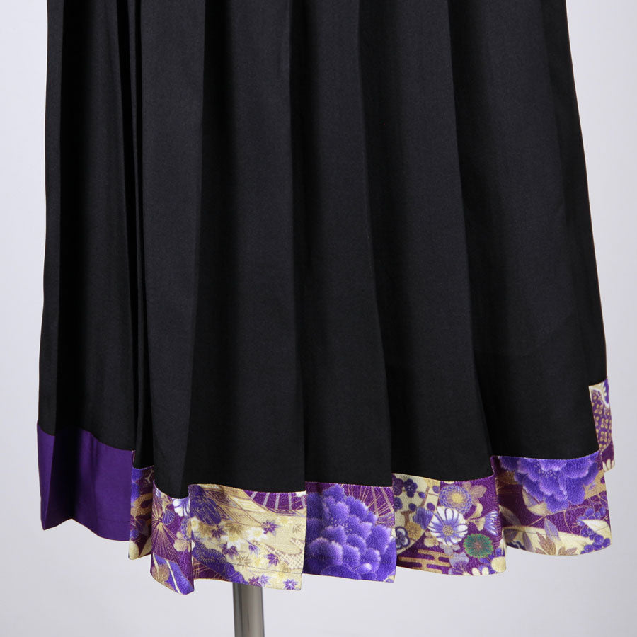 裾部分には、牡丹、菊、松の葉、扇子などのおめでたい吉祥紋様が描かれた紫地の縮緬素材の和柄と紫の生地を切り替えてあります。