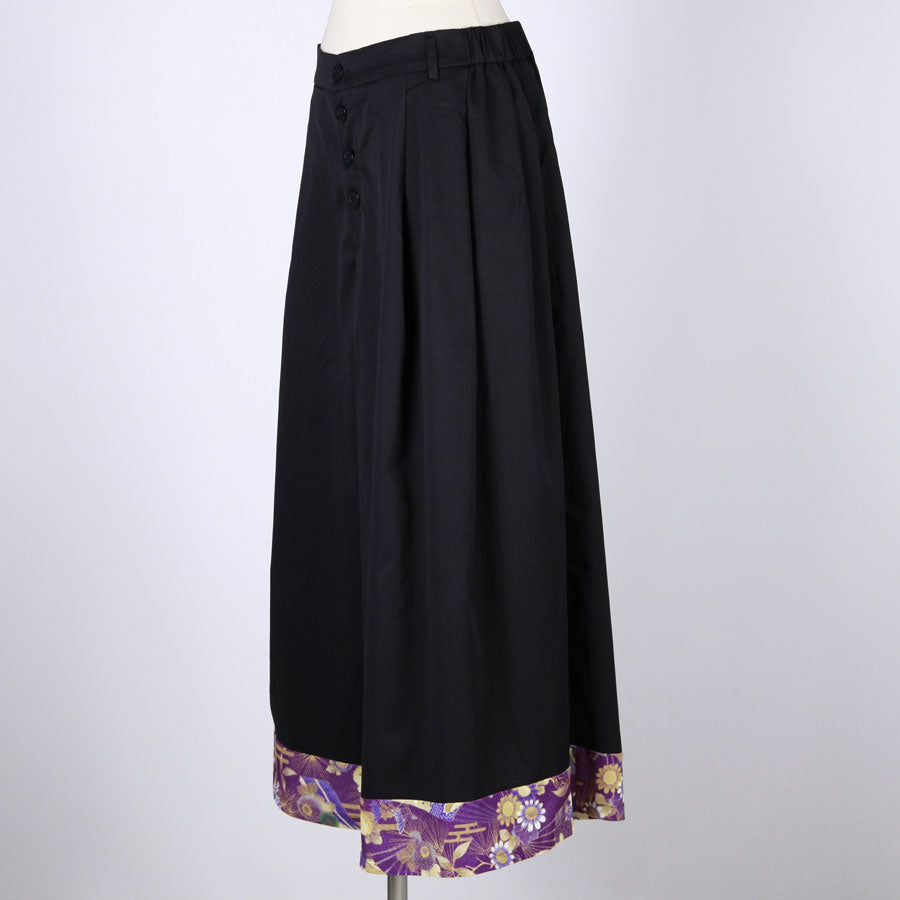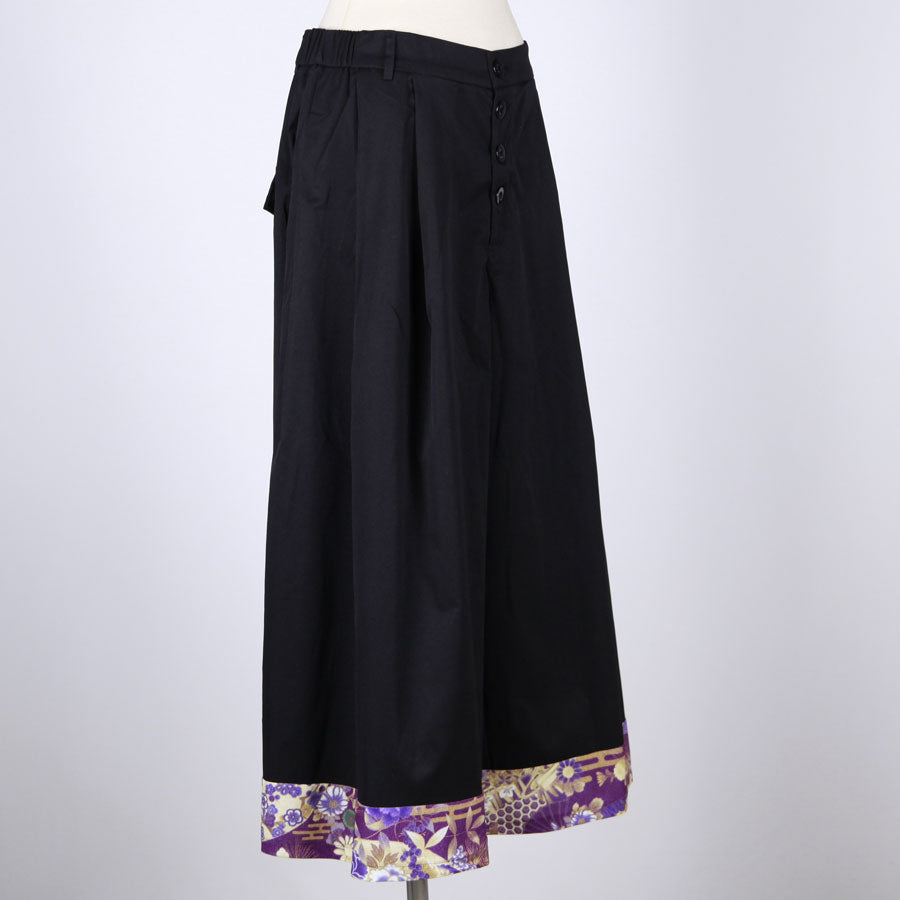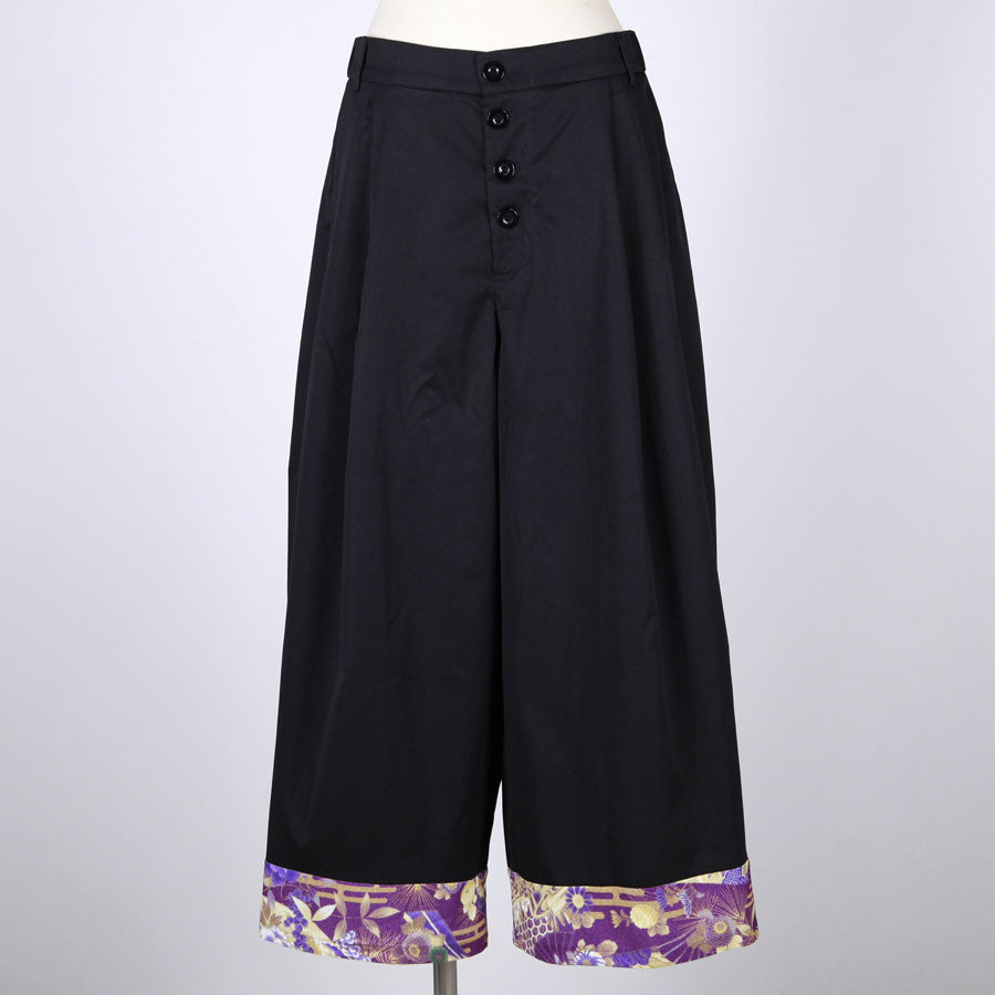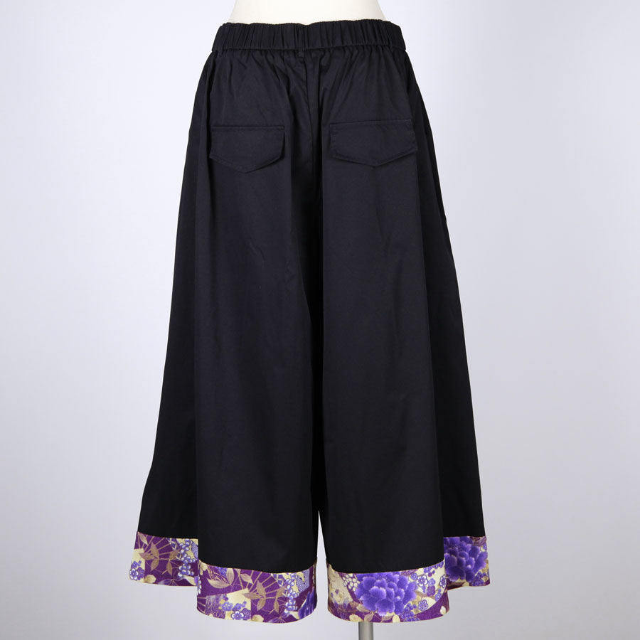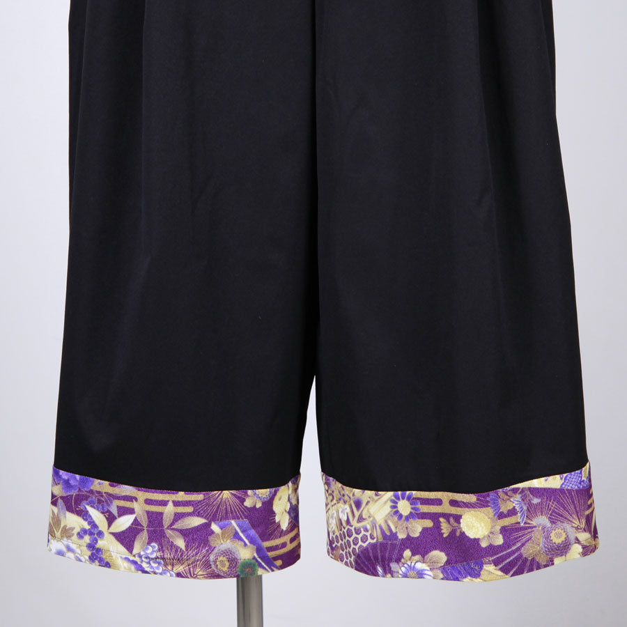 裾部分に牡丹、菊、松の葉、扇子などのおめでたい吉祥紋様が描かれた紫地の縮緬素材の和柄を切り替えたワイドパンツ。