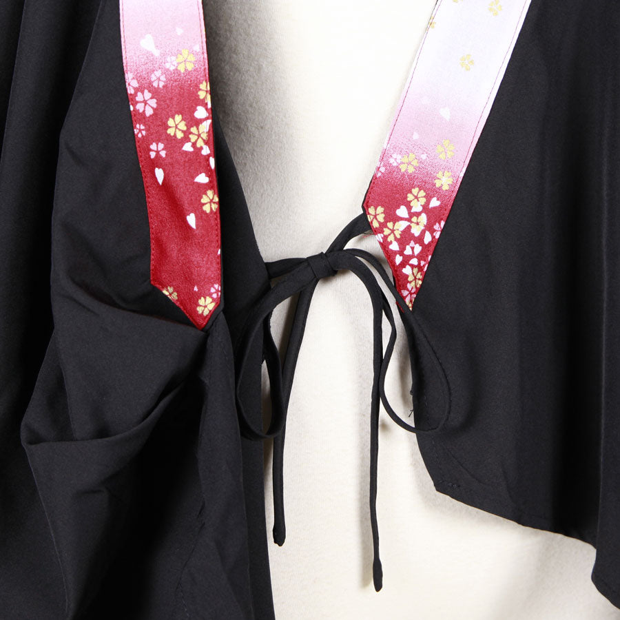 両側の襟ぐり部分には赤、ピンク、白でグラデーションの染め分けした下地に金色の桜が飛んでいる和柄を着物の掛襟のように縫い付けています。