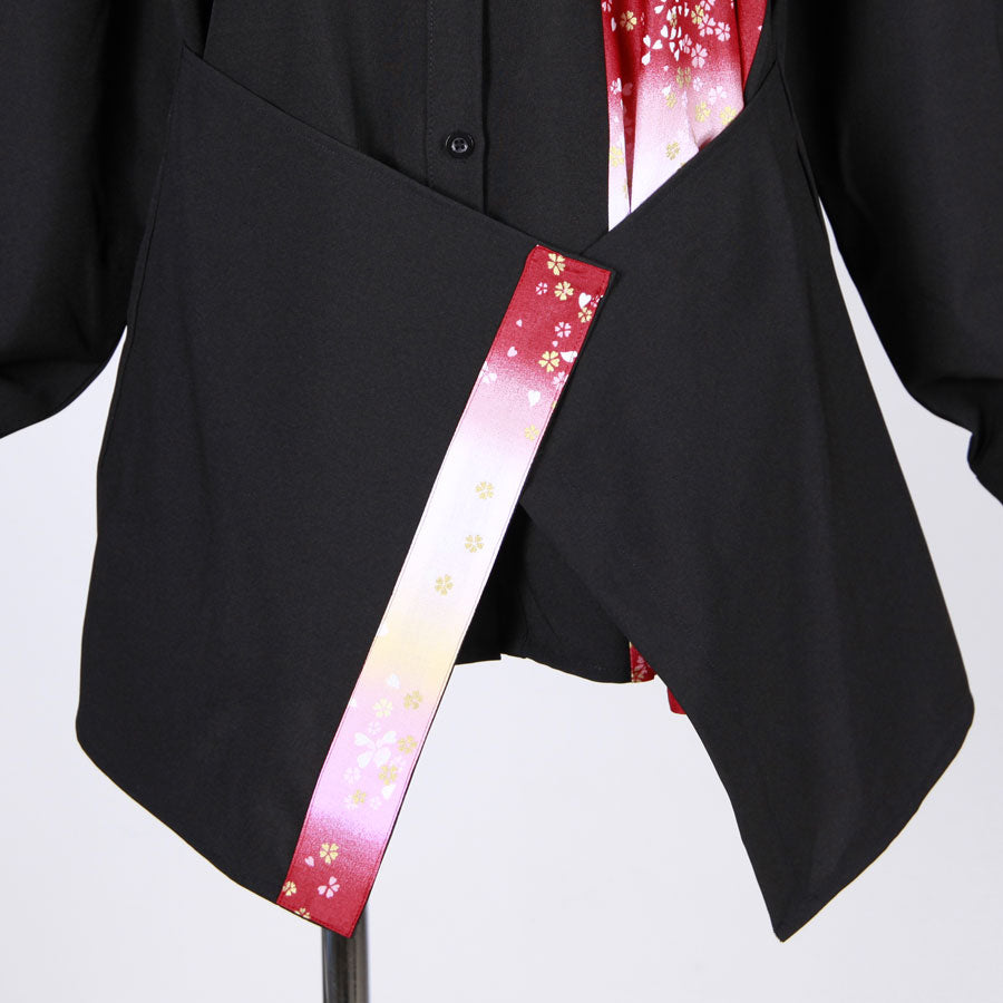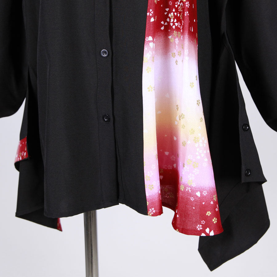 左肩から裾と腰当ての右端には赤、ピンク、白でグラデーションの染め分けした下地に金色の桜が飛んでいる和柄を使っています。
