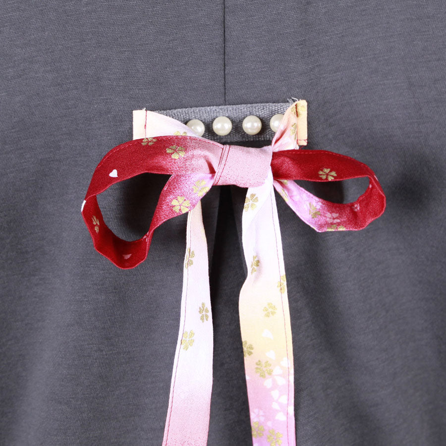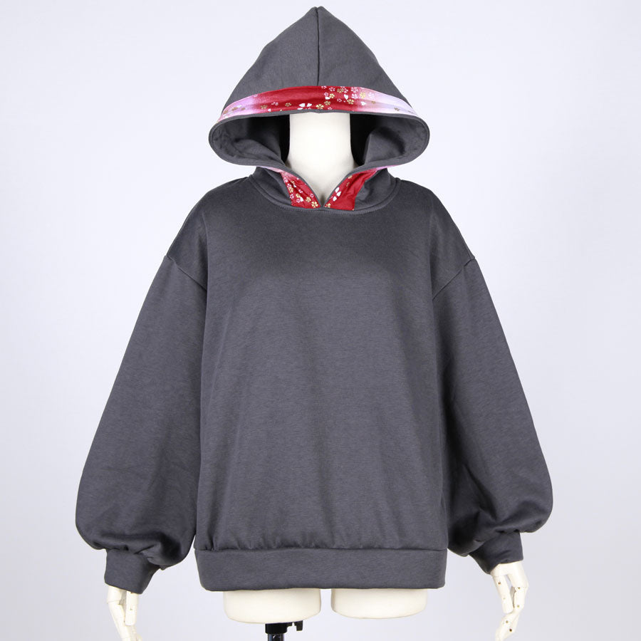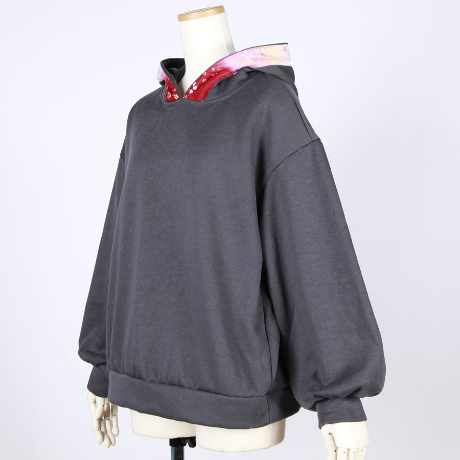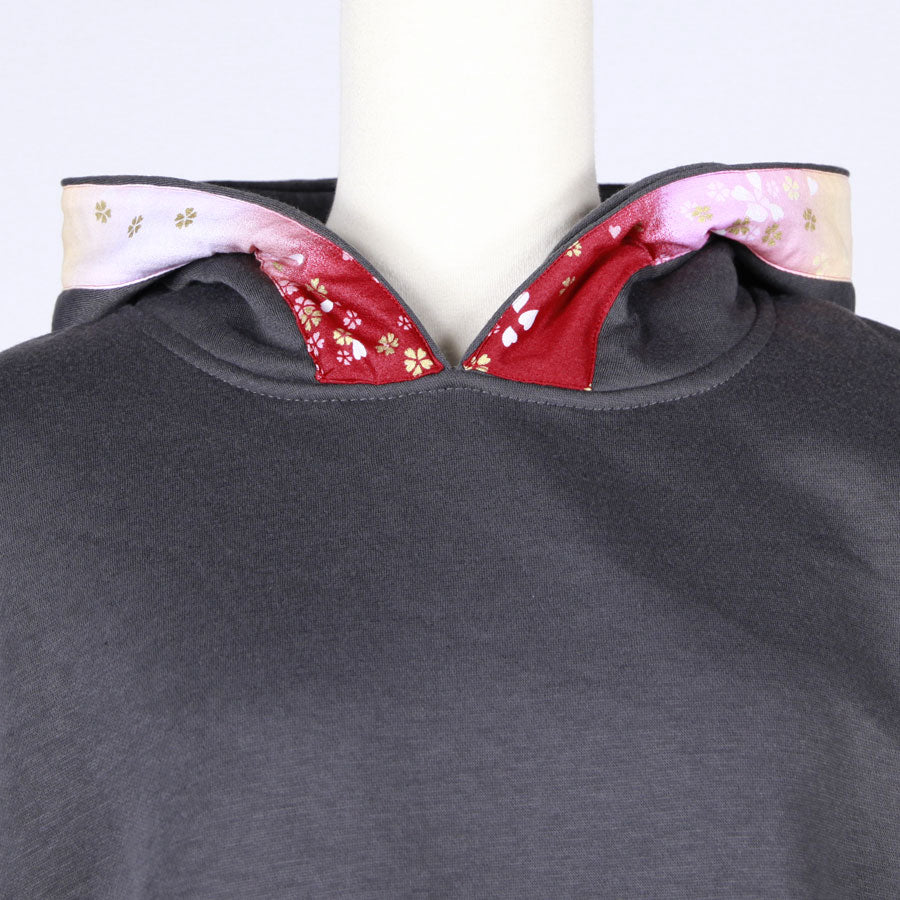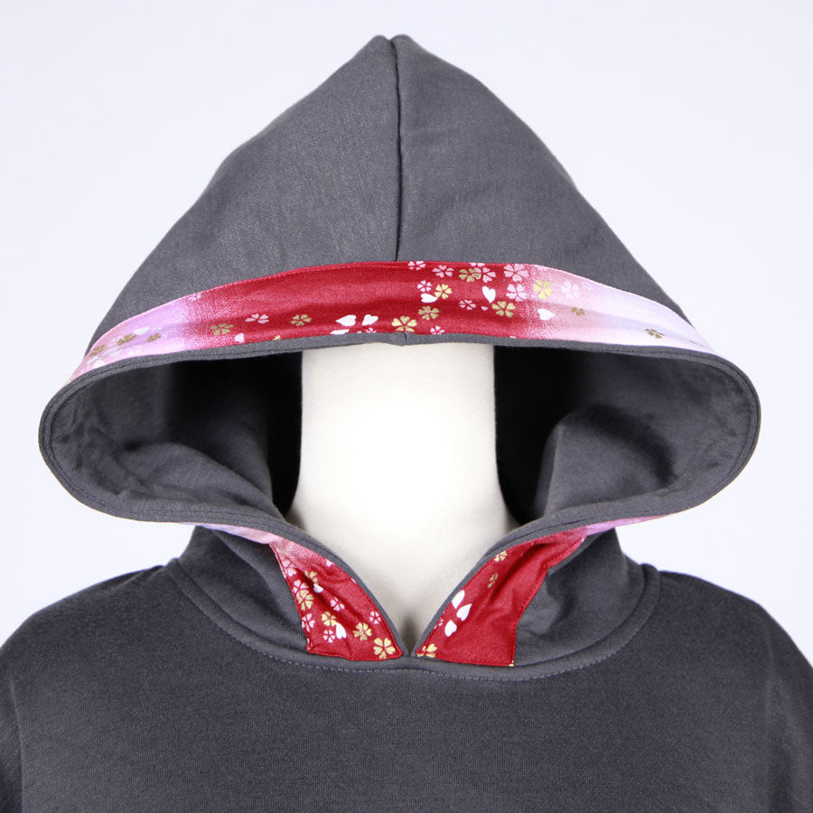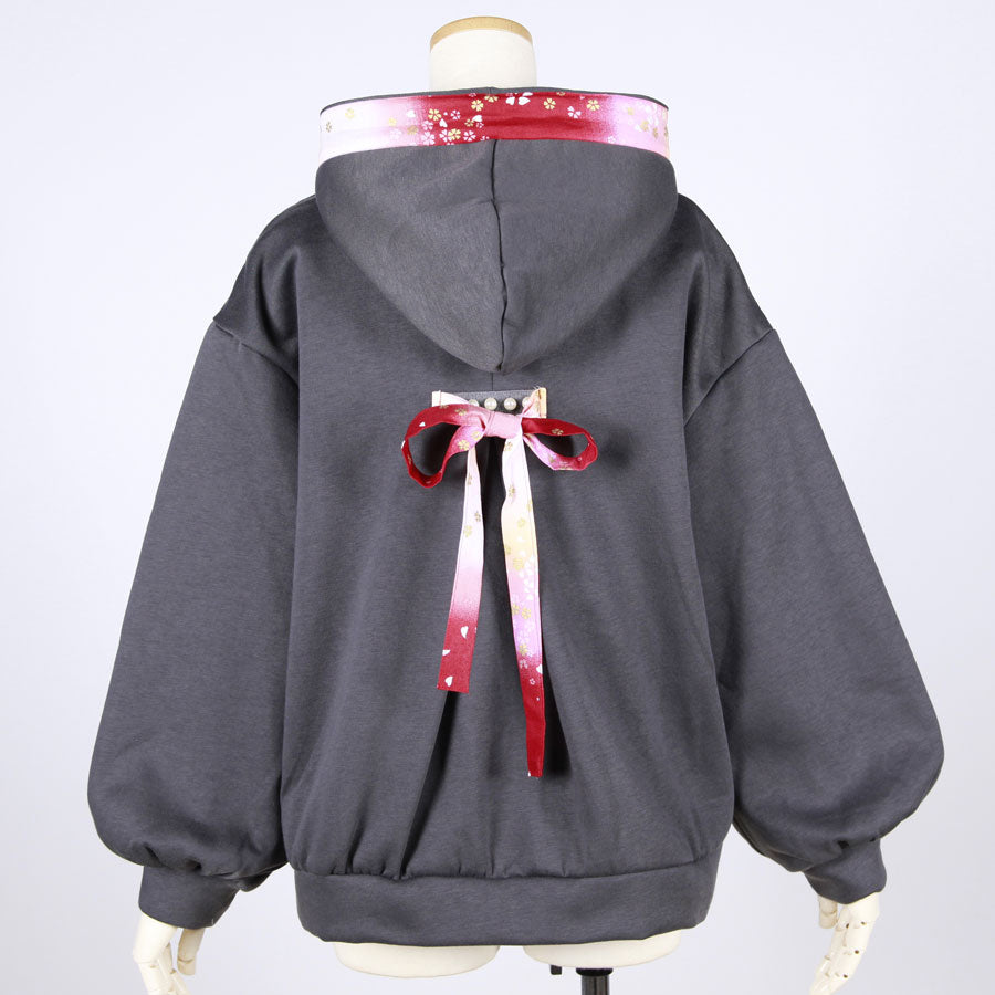その部分の紐とフード周りには赤、ピンク、白でグラデーションの染め分けした下地に金色の桜が飛んでいる和柄を使っています。