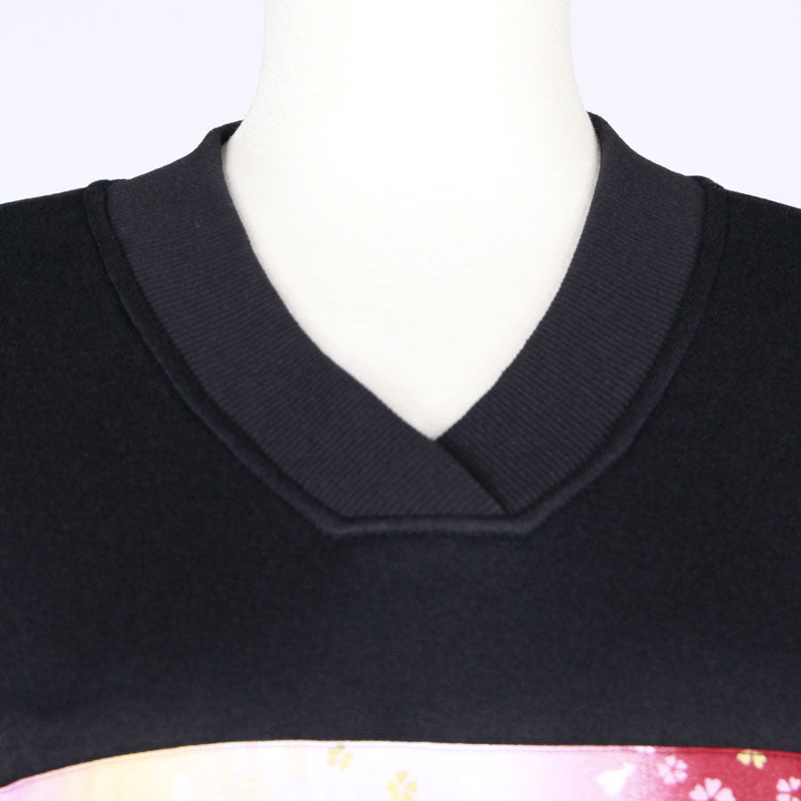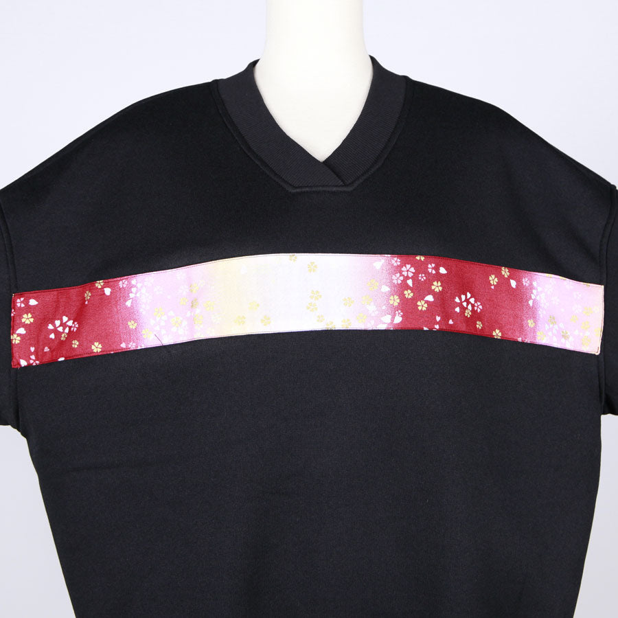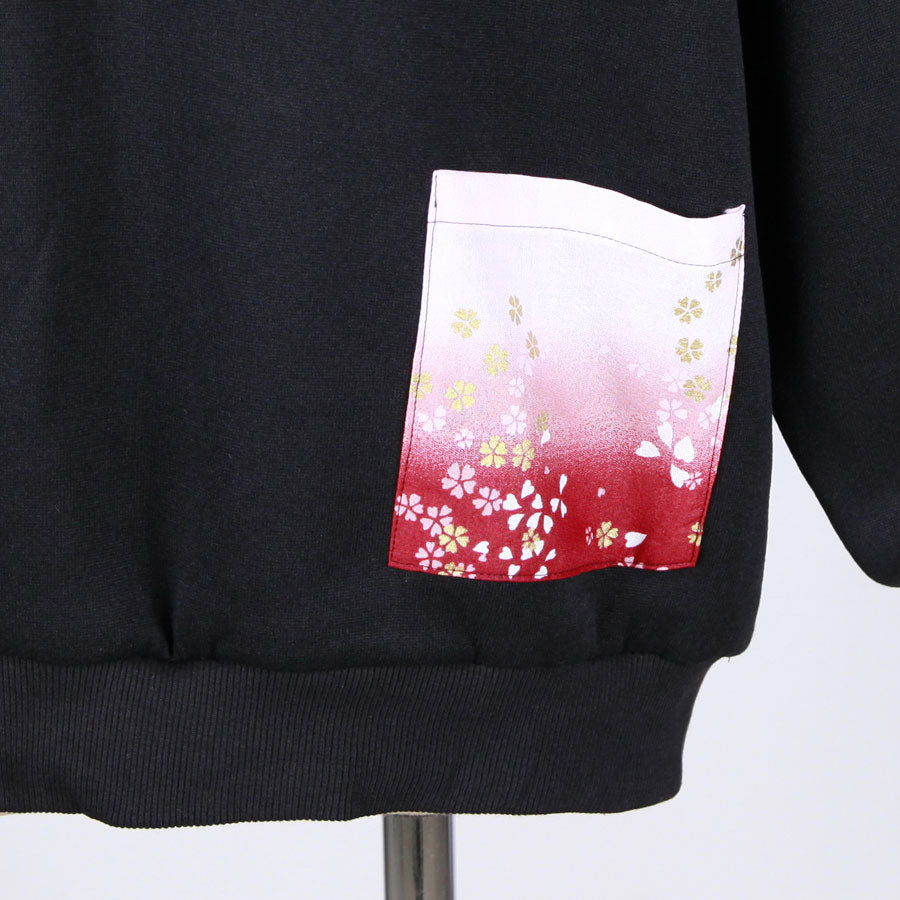 前の胸部分と後ろのポケットには赤、ピンク、白でグラデーションの染め分けした下地に金色の桜が飛んでいる和柄を使っています。