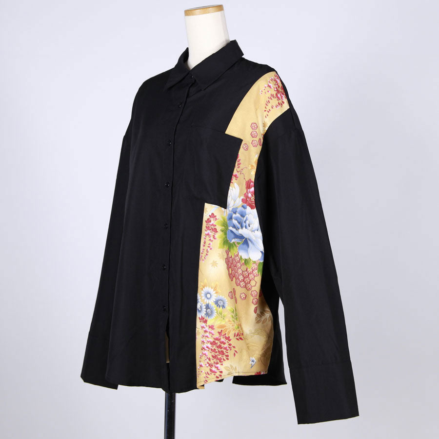 左の肩から裾に向けて昼間の明るさの中に佇む牡丹、乱菊、桜、紅葉、波などのさまざまな日本を象徴する四季の自然を描いた和柄を切り替えたシャツ。