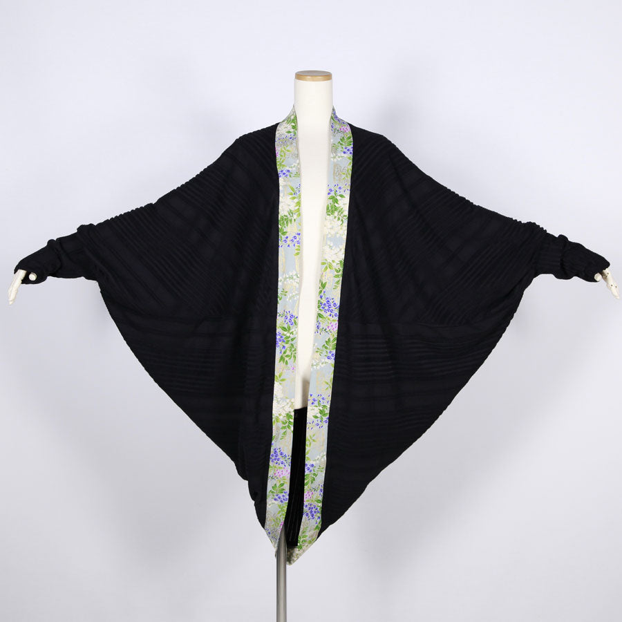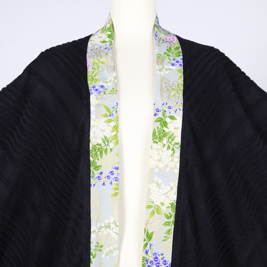 前端にぐるりと地が秘色色(ひそくいろ)に白、紫、桃色の藤が波模様の上に描かれた和柄を使った羽織り。
