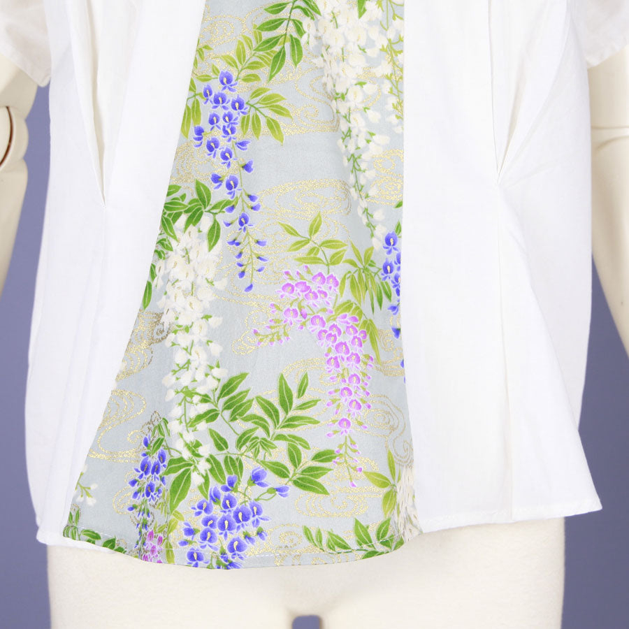 前中心切り替えに地が秘色色(ひそくいろ)に白、紫、桃色の藤が波模様の上に描かれた和柄を切り替えた布帛のノースリーブトップス。
