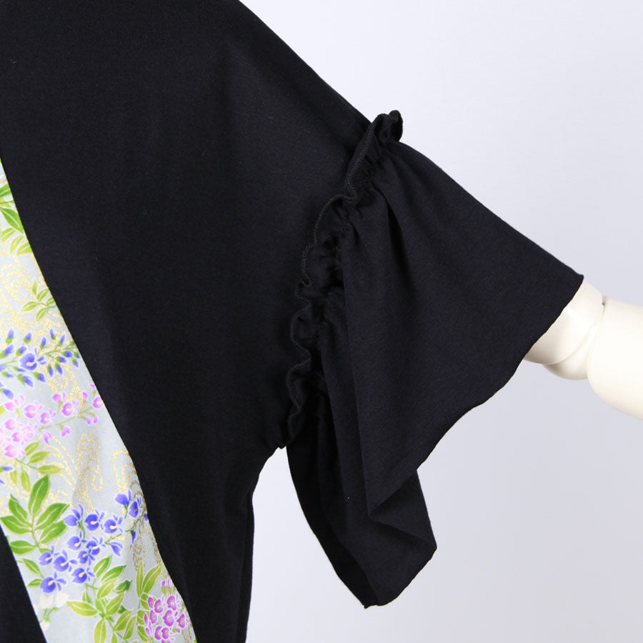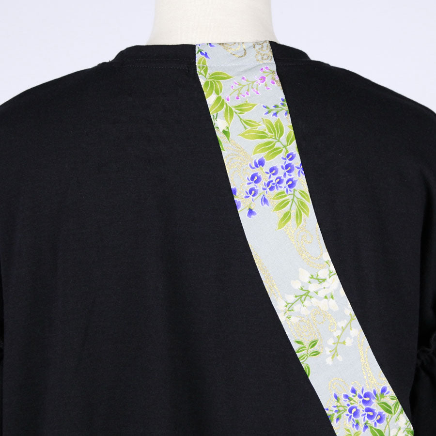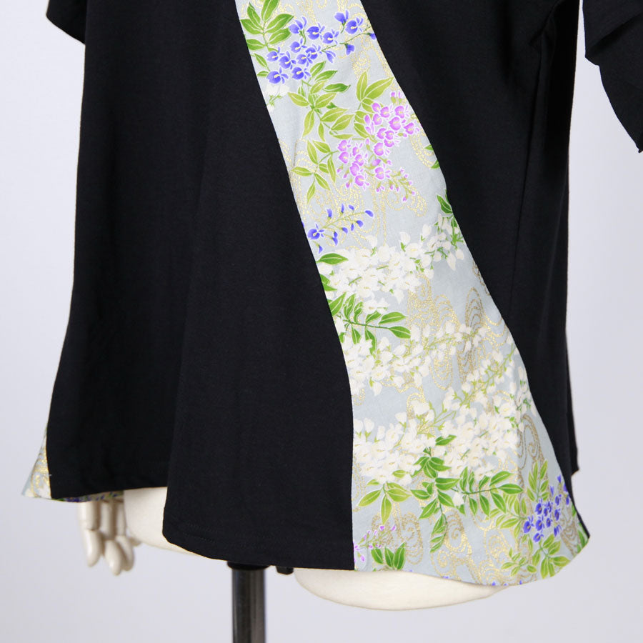 前中心から左脇へ、後ろ中心から右脇へくるくると地が秘色色(ひそくいろ)に白、紫、桃色の藤が波模様の上に描かれた和柄を切り替えたトップス。